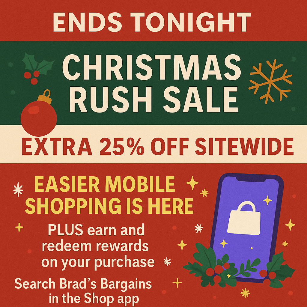 Shopping on a mobile device? Download the Shop app and search Brad’s Bargains for faster easier shopping or click the link: